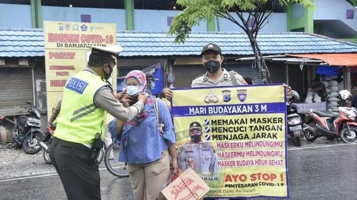 Direktur Lalu Lintas Polda Kalsel, Kombes Andi Aziz Nizar, melalui Kasubdit Kamsel, AKBP Nina Rahmi menjelaskan pihaknya beberapa hari ini melakukan kegiatan pembagian masker dan sosialisasi Protokol Kesehatan di simpang Jalan Kamboja, Fly Over Gatot Soebroto, Belitung, Pasar Lama dan Kuripan, Sabtu (31/10/2020).