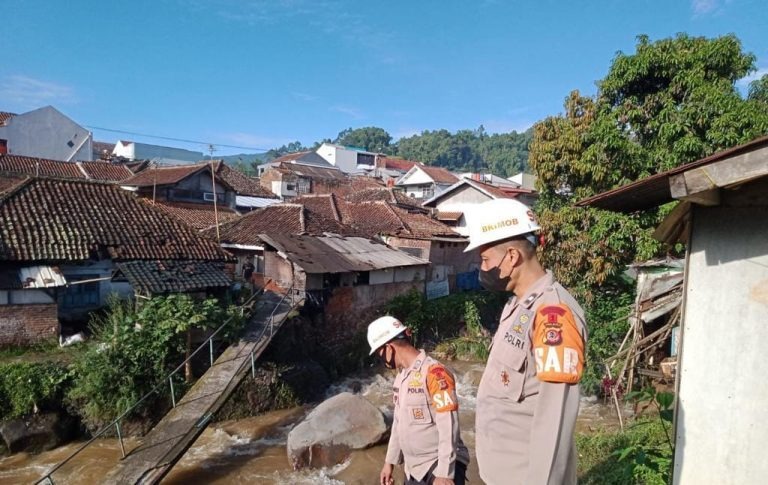 Tribratanews.polri.go.id - Bandung. Tim SAR Batalyon A Pelopor Satbrimob Polda Jabar, merespon cepat terhadap kejadian bencana alam, seperti hari ini Team SAR Brimob Jabar terjun langsung mengecek lokasi Banjir Bandang di Kecamatan Ciwidey Kabupaten Bandung. Rabu (08/06/22)