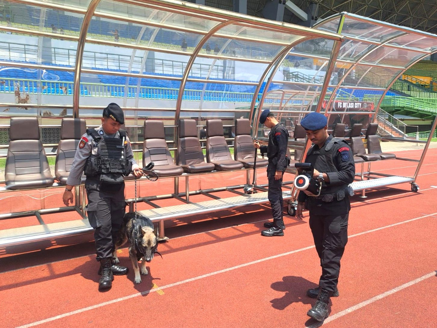 Tribratanews.polri.go.id - Bekasi. Brimob Polda Metro Jaya melalui Unit Jibom Detasemen Gegana bersama Unit K9 melakukan sterilisasi di Stadion Chandrabagha, Kota Bekasi, menjelang pertandingan sepak bola antara Bali United dan Sulawesi United. Halnini dilakukan demi memastikan masyarakat dapat menikmati pertandingan dengan aman dan nyaman.