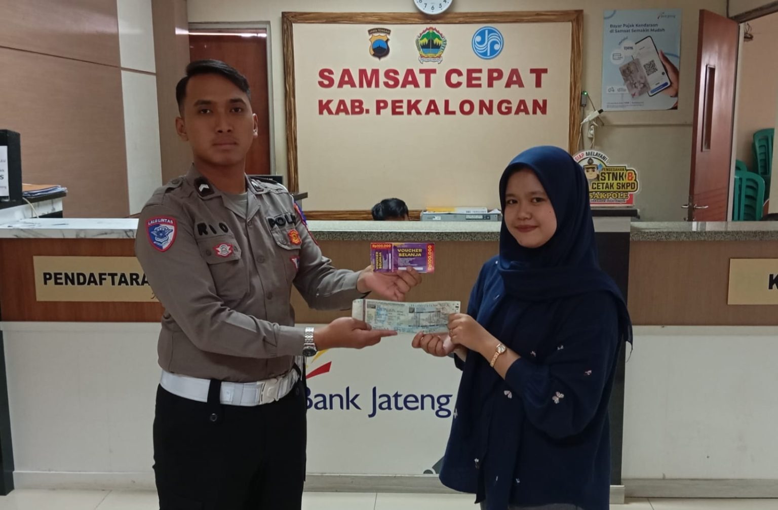 Tribratanews.polri.go.id - Jateng. Suasana berbeda tampak di Kantor Samsat Kabupaten Pekalongan pada Jumat, (28/11/2025). Program “Jumat Ceria” yang digelar hari ini berhasil menarik perhatian masyarakat yang datang untuk membayar pajak kendaraan. Tidak hanya disambut dengan pelayanan cepat dan ramah, para wajib pajak juga berkesempatan mendapatkan voucher belanja sebagai bentuk apresiasi atas kepatuhan mereka.