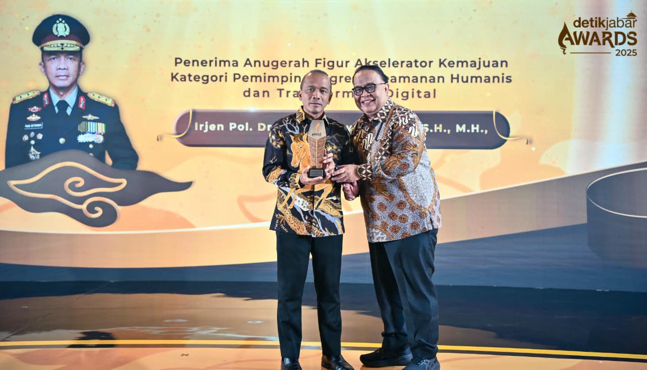 Tribratanews.polri.go.id - Bogor – Kapolda Jawa Barat Irjen Pol Rudi Setiawan meraih penghargaan dalam ajang detikJabar Award 2025 yang digelar di Hotel Salak The Heritage, Kota Bogor, Rabu (10/12/2025). Dalam acara tersebut, Irjen Rudi menerima trofi Tokoh Transformasi Keamanan Digital dan Inklusivitas Polri yang diserahkan langsung oleh Direktur Transmedia, Latif Harnoko.