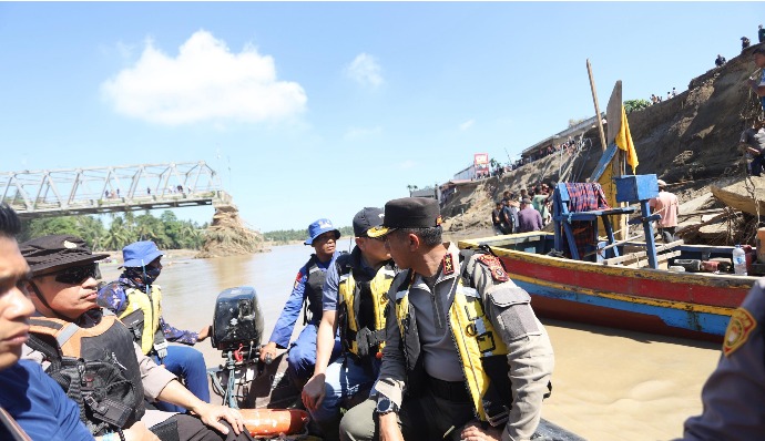 Dari jembatan yang terputus di sisi Bireuen, Kapolda Aceh menaiki perahu karet menuju sisi Kecamatan Kutablang yang menjadi salah satu titik tertahannya masyarakat yang hendak menuju arah Banda Aceh akibat jembatan penghubung di jalan nasional itu terputus akibat banjir.