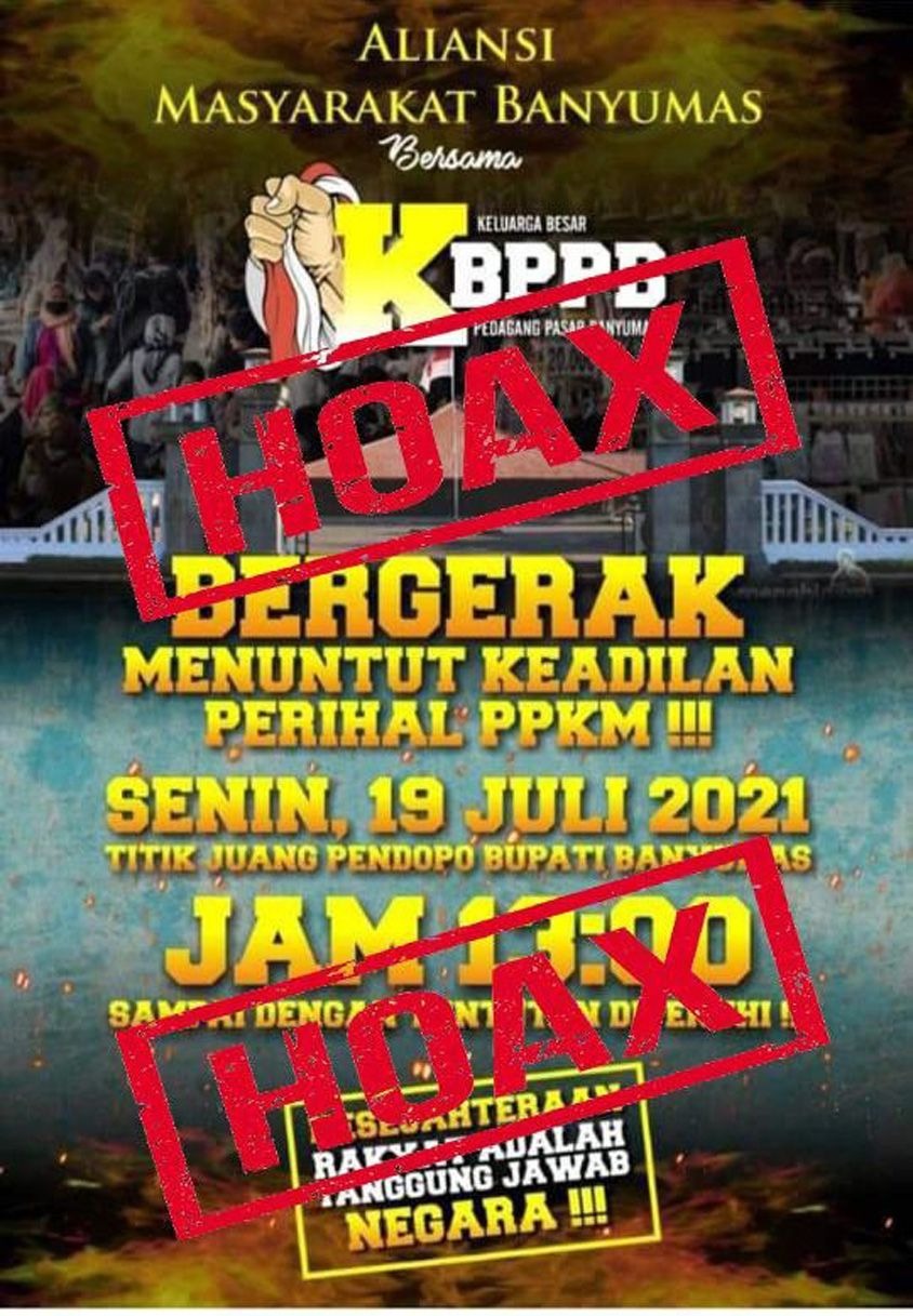 Poster ajakan demo Aliansi Masyarakat Banyumas yang beredar di media sosial tersebut telah ditandai hoaks.