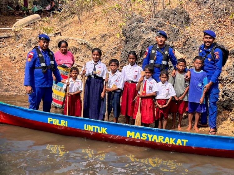 Tribratanews.polri.go.id - Rote Ndao. Ditpolairud Polda NTT membrikan bantuan berupa satu unit perahu dayung (sampan), dua buah dayung, dan empat life jacket kepada anak-anak Kampung Elenamon, Desa Tenalai, Kecamatan Landuleko, Kabupaten Rote Ndao, Selasa (26/8/25)