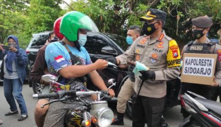 "Maka guna meminimalisir penyebaran COVID-19 di Sidoarjo. Mulai hari ini kami membagikan masker sebanyak 10 ribu. Setiap hari selama 10 hari .Peran masyarakat juga perlu, dengan cara harus menerapkan disiplin memakai masker. Langkah berikutnya kami tetap menindak bagi masyarakat yang tidak mematuhi protokol kesehatan. Dengan ditilang tipiring, bagi mereka yang sering terjaring maka dendanya dua kali lipatnya dari denda sebelumnya," pungkas Kapolresta.