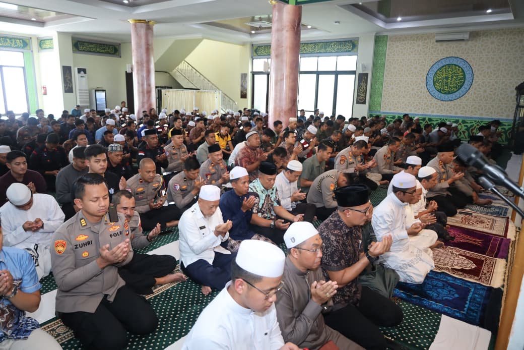 Shalat ghaib dilaksanakan di Masjid Riyadus Shalihin Polda Kalsel, Banjarbaru, Jumat (29/8/2025), setelah pelaksanaan shalat Jumat yang dihadiri oleh Kapolda Kalsel, Irwasda Polda Kalsel, Pejabat Utama Polda Kalsel, personel Polri dan ASN Polda Kalsel.