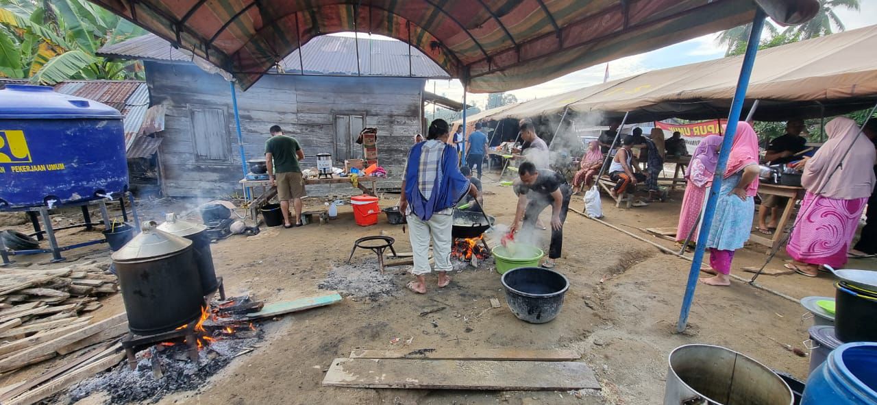 Pada Jumat (05/12/2025), sejak pagi hari, personel Brimob bersama warga setempat memasak makanan di dapur umum yang disediakan di posko. Bahan makanan diolah setiap hari untuk memenuhi kebutuhan konsumsi masyarakat terdampak, sekaligus personel gabungan yang tengah bertugas dalam misi kemanusiaan. Proses memasak dilakukan secara bergantian, melibatkan warga agar bantuan dapat menjangkau lebih banyak masyarakat.