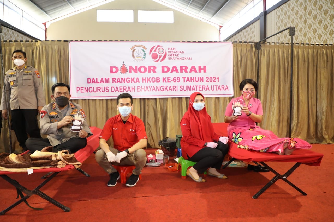 Bhakti sosial diikuti 100 anak yang di khitan dan donor darah berjumlah 500 orang, dalam kegiatan donor darah Kapolda Sumut Irjen Pol RZ Panca Putra bersama Ketua Bhayangkari Daerah Sumut Ny Rita Panca turut mendonorkan darahnya.